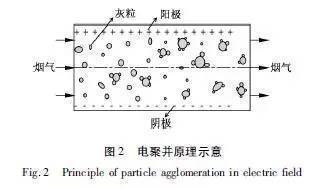 電聚并是各聚并技術(shù)中好實用有效的方法。電聚并是通過細顆粒荷電,促使細顆粒相互吸引、碰撞、聚并,使細顆粒團聚成大顆粒。電聚并的效果取決于粒子的濃度、粒徑、電荷的分布以及外電場的強弱(圖2)。