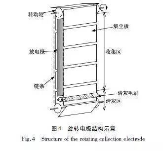 旋轉(zhuǎn)電極式電除塵器與常規(guī)電除塵器的除塵原理完全相同,在清灰方式上有很大改變。旋轉(zhuǎn)電極是由若干個小塊極板固定在板鏈上低速旋轉(zhuǎn),極板由原來的整體壓型板改為小塊極板,通過板鏈帶動旋轉(zhuǎn)。其清灰方式采用旋轉(zhuǎn)鋼刷清灰,從根本上改變了常規(guī)電除塵器的振打裝置清灰,徹底避免了振打清灰造成的二次揚塵,同時也解決了高比電阻粉塵的“反電暈”問題]。